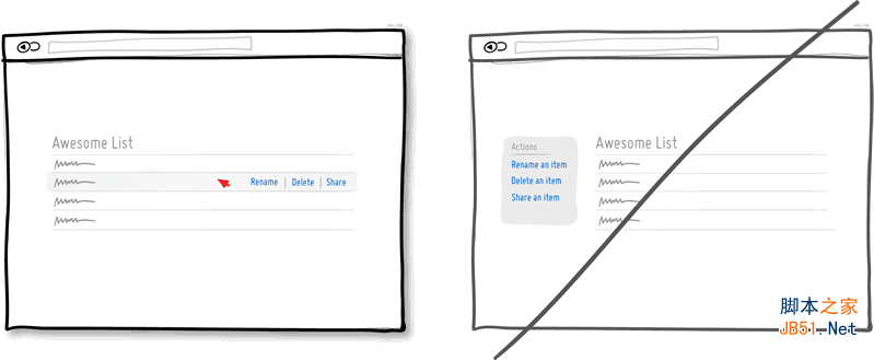 有時,可以讓某些特定的界面元素具有交互性,來觸發(fā)顯示相關(guān)的任務(wù)選項,而不是直接提供一系列關(guān)聯(lián)性不強的動作列表。例如,當呈現(xiàn)一個數(shù)據(jù)列表時,我們通常需要允許用戶對每條數(shù)據(jù)進行操作。你可以讓用戶通過鼠標懸停使每個列表單元中的相關(guān)操作呈現(xiàn)出來(刪除、重命名等等)。另外一個關(guān)于直接操作的常見案例就是點擊數(shù)據(jù)條目本身(譬如一段地址信息),使其進入編輯狀態(tài)。相比于無視上下文情境而直接展示各種操作選項,這種交互模式可以讓用戶更加聚焦于當前的目標,減少界面復雜性和操作步驟。但要記住,對于一些較為常規(guī)的、情境化確實不強的普通操作來說,情境菜單仍有它的用處。