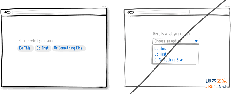 你每使用一個下拉菜單,就會隱藏掉一些行為選項,用戶就會需要多付出些力氣來找到它們。如果那些隱藏掉的選項是要被放置在用戶瀏覽內(nèi)容、完成決策的主要路徑上的,那么你也許應(yīng)該考慮一下將它們一覽無余的呈現(xiàn)出來。而對于那些可以預計的、無需學習成本的操作,例如選擇日期和時間,或地理位置設(shè)置等,仍可以保持下拉菜單的形式。有時,下拉菜單也可以適用于那些需要用戶反復執(zhí)行相同動作的界面;但如果某些操作是保證轉(zhuǎn)化率提升的主要Call to Action,在考慮下拉菜單的時候還是小心為妙。