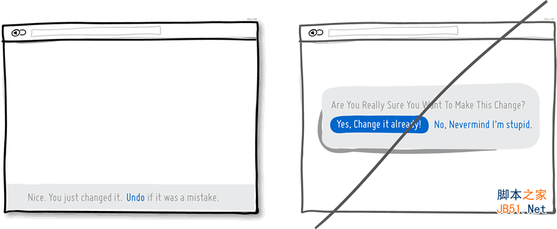 設(shè)想一下,你剛剛點擊了一個按鈕或鏈接。撤銷功能尊重人類的基本意圖,允許首先平滑的產(chǎn)生相應(yīng)的行為。而另一方面,彈出確認的形式會質(zhì)疑用戶的意圖,致使用戶對自己要做的事情產(chǎn)生疑慮。我愿意假設(shè),多數(shù)時候,用戶的行為都符合自己的意圖,誤操作只是少數(shù)情況。當用戶需要反復執(zhí)行某個行為的時候,低效、丑陋的彈出確認就會一遍一遍的呈現(xiàn),非常不人性化。嘗試通過撤銷功能讓用戶感覺自己正在充分控制局面,盡量不要通過確認來提出質(zhì)疑。
