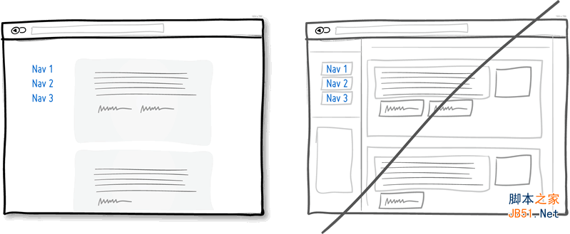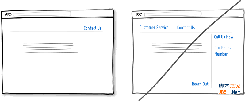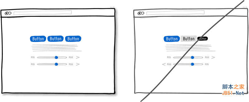 例如配色、層次、對比等視覺風格要素可以幫助人們更好的理解和使用你的產(chǎn)品界面,讓他們知道自己現(xiàn)在在哪,接下來可以去哪。為了清晰的呈現(xiàn)這些信息,可點擊元素(鏈接、按鈕)以及可選擇項目(選項)、普通文字內(nèi)容的視覺風格必須彼此形成顯著的差異,并且在全局范圍內(nèi)保持風格的一致性。在下面的草圖范例中,我使用藍色來表示可點擊元素,黑色文字表示已選擇或當前所在位置標題。如果你能正確的使用視覺風格,用戶將能更好的通過這些視覺線索瀏覽界面。絕不要讓這幾類視覺元素的呈現(xiàn)方式含糊不清,否則你就是在給用戶找麻煩。