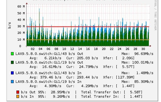 以下流量圖為我們一臺(tái)母機(jī)一個(gè)月的流量情況,從圖中可以看到,高峰期的時(shí)候,我們服務(wù)器的帶寬使用高達(dá)40M,一個(gè)月總共消耗了近7000GB的流量,可以想象,如果我們把帶寬限制到10M的話,所有客戶幾乎會(huì)流失70%的訪問量。也許有客戶問,為什么我們服務(wù)器能用這么多的流量,而不是2000G,答案很簡(jiǎn)單,我們購買了大量的流量以供我們客戶使用,這也是為什么我們VPS價(jià)格會(huì)貴一些。