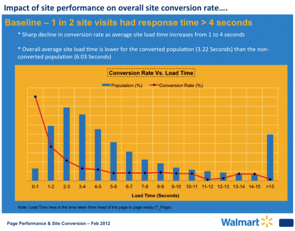 我們來看沃爾瑪?shù)睦?,當沃爾瑪發(fā)現(xiàn)他們不是互聯(lián)網(wǎng)領域訪問速度最快的零售商,比起EBay、Amazon等,他們決定不遺余力提升站點速度,測試結(jié)論如下(這里是原文 ):