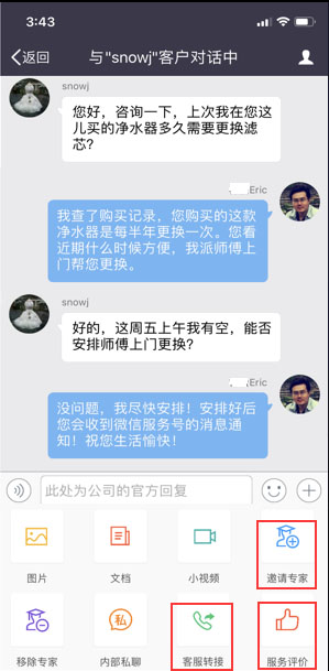 - 當(dāng)客戶問題較為復(fù)雜專業(yè)、或超出客服人員能力之外,這時,客服可通過“邀請專家”功能,將顧問專家拉入群組中,為客戶解決問題