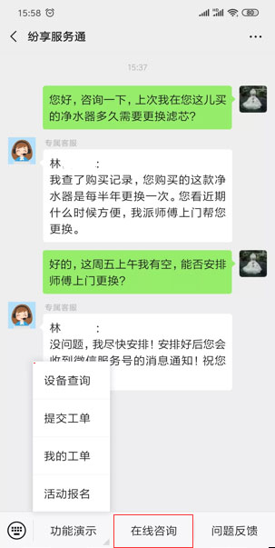 - 同微信公眾號打通,客戶微信端咨詢直達(dá)紛享企信工作臺