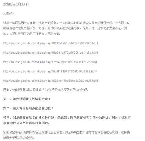 另外,關(guān)于外鏈的質(zhì)量,可能直到現(xiàn)在,很多朋友都會(huì)把網(wǎng)站的權(quán)重當(dāng)做是最重要因素,雖然知道外鏈要考慮相關(guān)度,但是在今天這樣的大環(huán)境下,相關(guān)度的重要性在很多朋友眼中都是低于鏈接承載網(wǎng)站的權(quán)重的。今天百度綠蘿2.0的公告,就是告訴你,不要只看平臺(tái)的權(quán)重,寶寶樹高不高?網(wǎng)易高不高?大型新聞源又怎么樣?在百度眼中,新聞源只是比個(gè)人的草根站點(diǎn)稍微牛一點(diǎn),但本質(zhì)上都是一樣要依賴百度。看你不爽一樣懲罰!