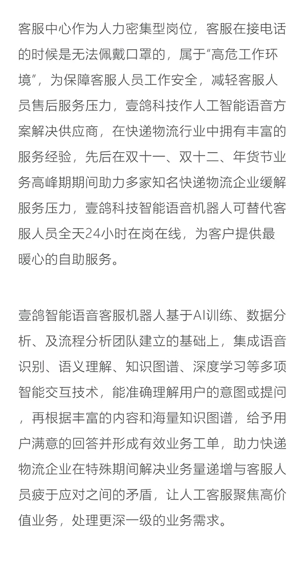 巨人網(wǎng)絡(luò)通訊聲明:本文標(biāo)題《壹鴿智能語(yǔ)音機(jī)器人全天24小時(shí)在線 --助力快遞企業(yè)為客戶送上最暖心的自助服務(wù)》,本文關(guān)鍵詞 壹鴿,智能,語(yǔ)音,機(jī)器人,;如發(fā)現(xiàn)本文內(nèi)容存在版權(quán)問(wèn)題,煩請(qǐng)?zhí)峁┫嚓P(guān)信息告之我們,我們將及時(shí)溝通與處理。本站內(nèi)容系統(tǒng)采集于網(wǎng)絡(luò),涉及言論、版權(quán)與本站無(wú)關(guān)。