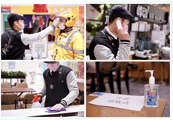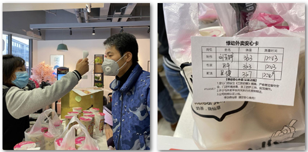 在管理上,員工每天測(cè)溫上崗,全程口罩防護(hù),門店環(huán)境、器皿定時(shí)消毒,使用免排隊(duì)小程序點(diǎn)單。外賣騎手測(cè)溫防護(hù),上線“安心卡”安全管理,全程無(wú)接觸外賣配送。