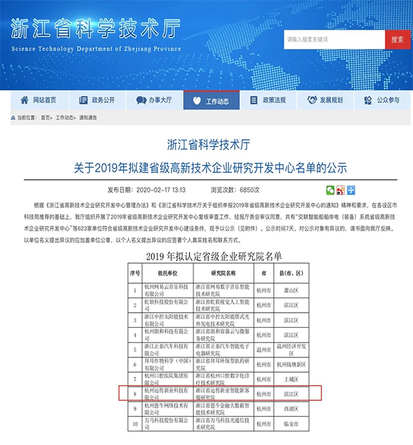近日,浙江省科技廳公布了2019年認(rèn)定省級(jí)企業(yè)研究院名單,“浙江省遠(yuǎn)傳新業(yè)智能新客服研究院”榜上有名。這也是遠(yuǎn)傳繼被認(rèn)定為浙江省高新技術(shù)研究開(kāi)發(fā)中心之后,技術(shù)開(kāi)發(fā)實(shí)力邁入的新臺(tái)階。