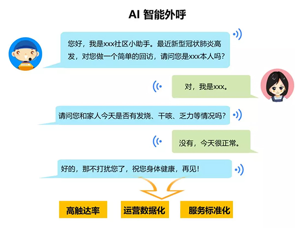 減輕一線防控人員工作壓力,AI有巨大發(fā)揮空間,容聯(lián)推出的疫情防控智能機(jī)器人解決方案(在線問(wèn)答型+智能外呼)可快速、精準(zhǔn)交流信息,提供高效智能外呼服務(wù),主動(dòng)探詢、排查疫情信息、疫情語(yǔ)音通知,并做統(tǒng)計(jì)、分析與處理,目前容聯(lián)AI防疫解決方案已經(jīng)應(yīng)用到各類企業(yè)、政府、醫(yī)療組織的各類防疫場(chǎng)景中。