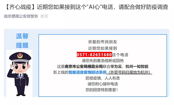 原來,這是南京市公安局棲霞分局部署的智能語音疫情回訪系統(tǒng),通過AI化解疫情回訪數(shù)據(jù)量巨大、易疏漏、采集跟蹤不及時等問題。
