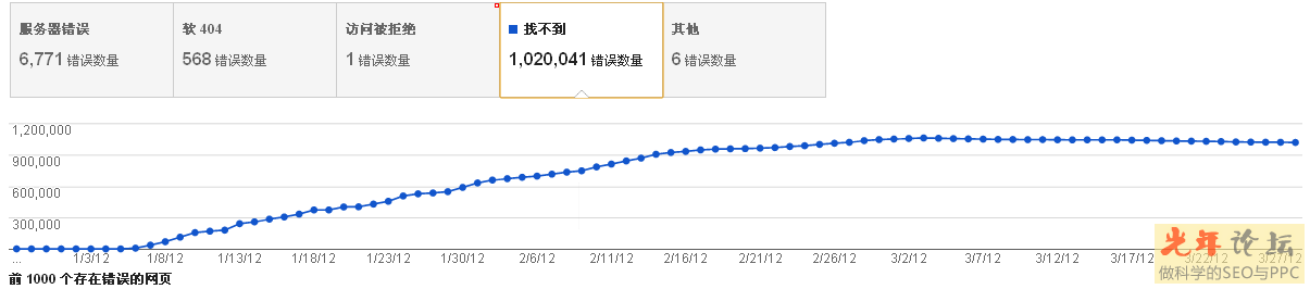 下面是另一個(gè)網(wǎng)站由于改版問題沒做跳轉(zhuǎn)和抓取攔截所造成的找不到抓取錯(cuò)誤,有一很完整的曲線可以讓你很清晰的看見網(wǎng)站存在的這方面的問題的變化趨勢(shì)
