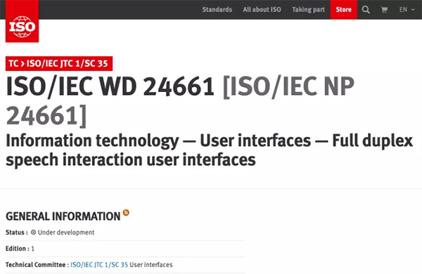 2020年1月13至17日,在韓國(guó)釜山舉行的ISO/IEC JTC 1/SC 35全會(huì)上,由科大訊飛主導(dǎo)、聯(lián)合中國(guó)電子技術(shù)標(biāo)準(zhǔn)化研究院和中科院自動(dòng)化所,提出的全雙工語(yǔ)音交互國(guó)際標(biāo)準(zhǔn)正式獲批立項(xiàng)(ISO/IEC 24661 Information technology - User interfaces - Full duplex speech interaction)。該標(biāo)準(zhǔn)也成為在人機(jī)交互領(lǐng)域中,首個(gè)由中國(guó)牽頭制定的智能語(yǔ)音交互國(guó)際標(biāo)準(zhǔn)。