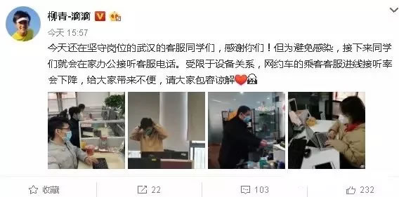 各大企業(yè)也在新肺疫情期間積極行動,滴滴公司總裁柳青提議讓客服回家辦公,接聽客服電話為用戶提供服務,并感謝堅守在武漢的客服同事。