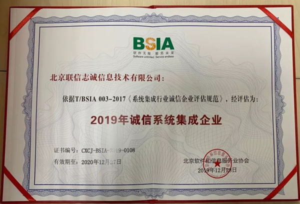 近日,北京軟件和信息服務(wù)業(yè)協(xié)會(huì)公布了2019年北京市誠(chéng)信系統(tǒng)集成企業(yè)名單,MyComm榮獲“2019年北京市誠(chéng)信系統(tǒng)集成企業(yè)”稱號(hào),肯定了我司多年來(lái)在企業(yè)產(chǎn)品質(zhì)量、履約情況、內(nèi)部管理體系、政府部門信用記錄等多方面的工作成果突出。
