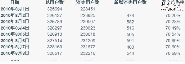 首先需要明確的是用戶的流失可能并不是永久的,也許用戶在一段時間內(nèi)對網(wǎng)站確實沒有任何需求,那么他會遠(yuǎn)離網(wǎng)站一段比較長的時間;或者流失用戶也會因為網(wǎng)站的某次營銷或者網(wǎng)站質(zhì)量的改善而重新回來。網(wǎng)站總的流失用戶數(shù)的計算比較簡單,以超過1個月內(nèi)登錄即為流失為例,那么總流失用戶數(shù)就是所有“當(dāng)前時間點-用戶最近一次時間點》1個月”的用戶數(shù)量。但是單純的總流失用戶數(shù)量對于分析是沒有意義的,因為大部分情況下這個數(shù)值是一直遞增的,我們需要計算總流失用戶數(shù)占總用戶數(shù)的比例及新增流失用戶數(shù),觀察它們的變化趨勢,如下表: