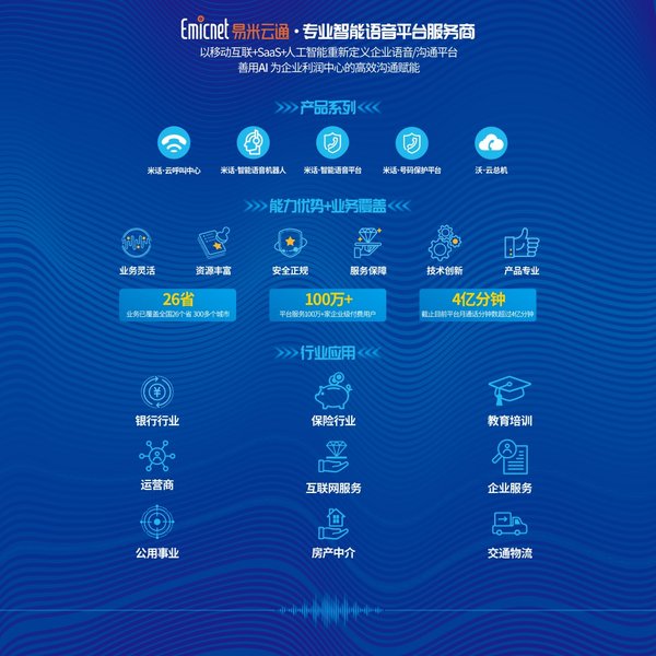 易米云通為大量500強企業(yè)及行業(yè)頭部客戶提供智能語音解決方案。以融合人工智能實現(xiàn)人機協(xié)作的易米云通米話·智能語音平臺4.0,賦能企業(yè)利潤中心進行高效溝通,為企業(yè)在人口紅利逐漸消失的年代進行降本增效正是大勢所趨。