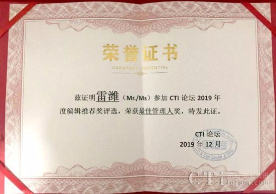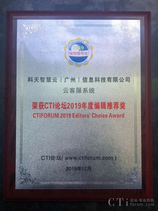 CTI論壇作為中國領(lǐng)先的ICT行業(yè)媒體,依托多年來積累的強大行業(yè)資源和經(jīng)驗,和廣大用戶一起,推選出2019年度ICT領(lǐng)域(呼叫中心、企業(yè)通信、增值電信等)的優(yōu)秀技術(shù)產(chǎn)品、解決方案、從業(yè)人員。連續(xù)兩年獲獎,表明科天云呼叫中心系統(tǒng)獲得了業(yè)界及用戶的認可。