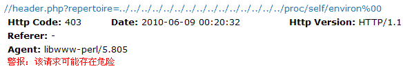 例如下圖的4個(gè)請(qǐng)求信息。/admin/editor/db/kmoxewebeditor.mdb等幾個(gè)資源都是不是本站的資源,所以Http Code不是403就是404,但從名稱分析,可能是保存數(shù)據(jù)庫信息的文件,如果這些信息讓別人拿走,那么攻擊你的網(wǎng)站就輕松多了。發(fā)起這些請(qǐng)求的目的無非就是掃描你的網(wǎng)站漏洞,通過漫無目的地掃描下載這些已知的漏洞文件,很可能會(huì)發(fā)現(xiàn)你的網(wǎng)站某個(gè)漏洞哦!通過觀察,可以發(fā)現(xiàn),這些請(qǐng)求所使用的Agent差不多都是Mozilla/4.0、Mozilla/5.0或者libwww-perl/等等非常規(guī)的瀏覽器類型,以上我提供的日志格式化工具已經(jīng)集成了對(duì)這些請(qǐng)求的警報(bào)功能。我們可以通過禁止這些Agent的訪問,來達(dá)到防止被掃描的目的,具體方法下面再介紹。