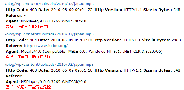 如果在日志中,你發(fā)現(xiàn)某個(gè)資源(網(wǎng)頁、圖片和mp3等)被人頻繁訪問,那你應(yīng)該注意該資源被用于何處了!如果這些請(qǐng)求的來源(Referer)不是你的網(wǎng)站或者為空,且狀態(tài)碼(Http Code)為200,說明你的這些資源很可能被人盜鏈了,通過 Referer 你可以查出盜鏈者的網(wǎng)址,這可能就是你的網(wǎng)站流量暴增的原因,你應(yīng)該做好防盜鏈了。請(qǐng)看下圖,我網(wǎng)站上的japan.mp3這個(gè)文件就被人頻繁的訪問了,下圖還只是日志的一部分,這人極其險(xiǎn)惡,由于我早已將該文件刪除,它遲遲要不到j(luò)apan.mp3,在短短一個(gè)小時(shí)內(nèi)對(duì)japan.mp3發(fā)起了不下百次的請(qǐng)求,見我設(shè)置了防盜鏈就偽造來源Referer和Agent,還不斷地更換IP,很可惜它做得都是無用功,根本沒有這個(gè)文件,請(qǐng)求的狀態(tài)碼Http Code都是403或者404