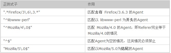 以上規(guī)則封殺了Agent中含有Firefox/3.6.3的來源,也就是包括以下例子的Agent將無法訪問你的網(wǎng)站: