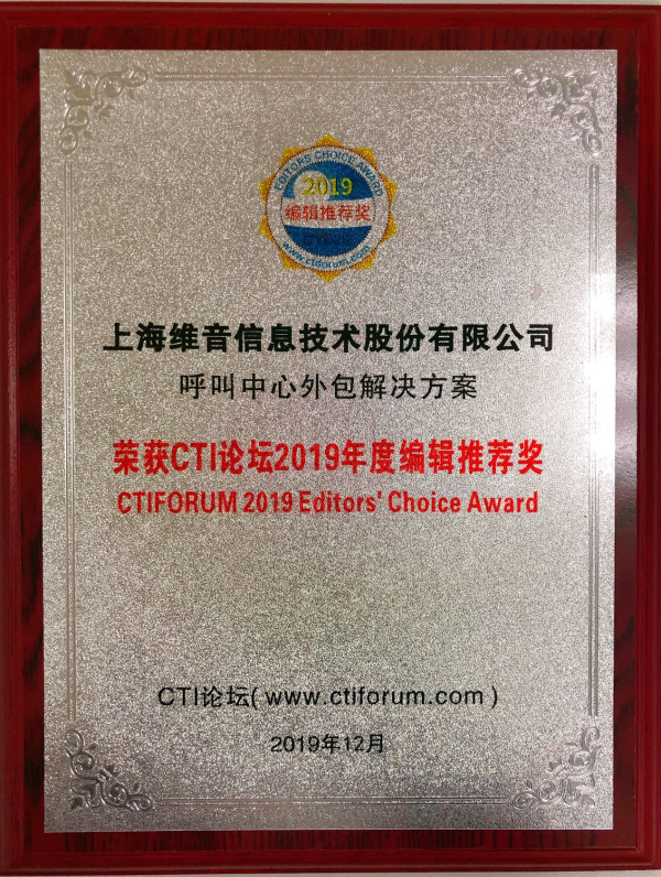 上海維音信息技術股份有限公司在本次CTI論壇2019年度“編輯推薦獎”評選榜中再次登榜。維音不僅是各個行業(yè)客戶所青睞的優(yōu)質合作伙伴,也是行業(yè)專家認可的專業(yè)供應商。連續(xù)多年榮獲CTI論壇“最佳編輯推薦獎”,既得到了行業(yè)內外的充分認可,同時也肯定了其在提供新一代外包服務方面的市場占有地位,及專業(yè)、高效地幫助客戶數字化轉型。