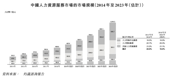 根據(jù)灼識咨詢研究,由于企業(yè)快速增長,加上人才短缺,中國新經(jīng)濟行業(yè)成為靈活用工市場的主要增長動力。數(shù)據(jù)顯示,中國目前擁有全球最多的獨角獸企業(yè),截至2017年底,約占全球獨角獸企業(yè)的40%。而服務新經(jīng)濟企業(yè)的靈活就業(yè)員工人數(shù)自2014年約121,200人增加至2018年的429,600人,預計至2023年將達到1,294,200人。