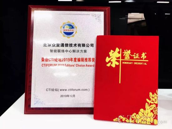 12月20日下午,2019年度CTI論壇編輯推薦獎頒獎暨行業(yè)應(yīng)用及市場分析主題沙龍?jiān)诒本┲嘘P(guān)村創(chuàng)業(yè)大街召開。會上揭曉了"CTI論壇2019年度優(yōu)秀技術(shù)產(chǎn)品及解決方案編輯推薦獎”及ICT領(lǐng)域個人獎項(xiàng),眾麥通信榮獲“智能聯(lián)絡(luò)中心解決方案”編輯推薦獎,眾麥通信產(chǎn)品總監(jiān)榮獲“最佳技術(shù)獎”。