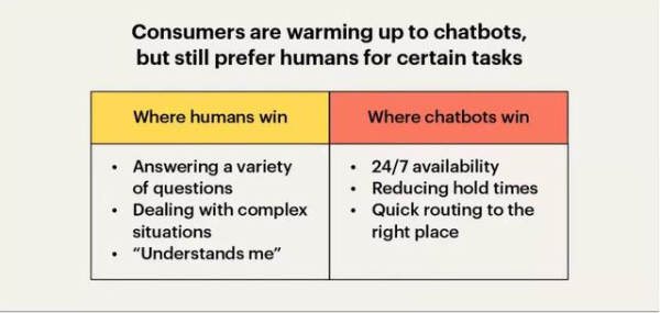 簡(jiǎn)言之,大多數(shù)消費(fèi)者都對(duì)聊天機(jī)器人抱有期待。也許大多數(shù)情況下,他們還是更喜歡人類,但在少數(shù)情況下,他們不在乎這種區(qū)別。