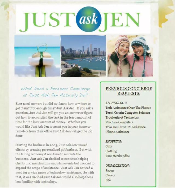 在綠色的方框中,你可以清晰地看到,「Just Ask Jen」的歷史服務(wù)項(xiàng)目:從幫助你購(gòu)買(mǎi)衣服等普通商品,到技巧性地幫助你購(gòu)買(mǎi)電腦;從幫你預(yù)定晚餐到教你學(xué)會(huì)某些特定的電腦軟件。