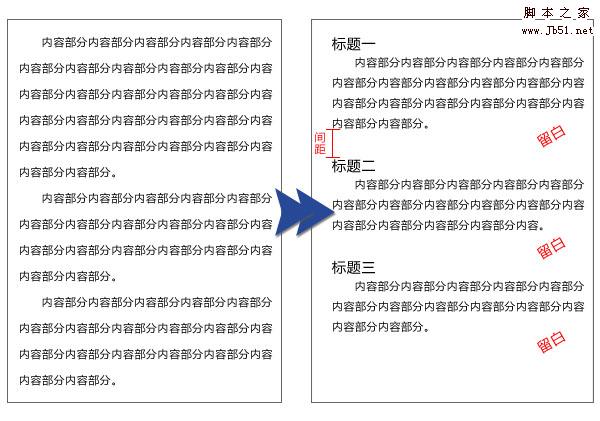 在編輯網(wǎng)站內(nèi)容時,大篇幅的內(nèi)容寫成幾個部分并標(biāo)上標(biāo)題,這樣用戶在閱讀時就能夠先閱讀標(biāo)題了解內(nèi)容,這樣用戶就不用費(fèi)很多時間閱讀自己不需要的章節(jié)了。當(dāng)然,章節(jié)標(biāo)題的意義是為了概述一段文字,因此標(biāo)題需要仔細(xì)斟酌,切不可隨意的安放一句話就當(dāng)做標(biāo)題。另外,標(biāo)題與內(nèi)容要比其他的信息接近,當(dāng)標(biāo)題和上下的文字間距相同時,標(biāo)題就會“飄”在兩段文字間,讓用戶茫然。標(biāo)題和文字間應(yīng)當(dāng)使用緊湊原則來布局,這樣用戶就能準(zhǔn)確的知道標(biāo)題概述的是哪個部分的內(nèi)容。如圖: