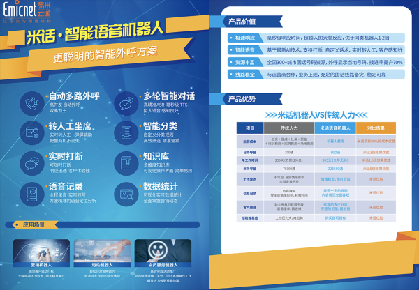 憑借對(duì)運(yùn)營商行業(yè)的深刻理解,易米云通將自主研發(fā)的AI語音機(jī)器人融入深耕多年且已具備國內(nèi)領(lǐng)先水平的智能語音通信領(lǐng)域,憑借強(qiáng)大的控制中臺(tái)進(jìn)行合規(guī)外呼,并且通過與運(yùn)營商系統(tǒng)的深度融合以及超卓的人機(jī)結(jié)合差異化服務(wù)功能,為運(yùn)營商提供了從客戶通知到業(yè)務(wù)受理的通信行業(yè)應(yīng)用場(chǎng)景全流程AI智能語音解決方案。