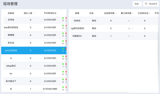環(huán)信客服“現(xiàn)場管理”功能,管理員可以直觀地看到技能組當前排隊情況、接待情況和組內(nèi)客服的工作情況,可及時調(diào)控接待壓力,安排人員為高負荷的技能組提供支持。進入“管理員模式>監(jiān)控管理>現(xiàn)場管理”頁面,支持按客服狀態(tài)、技能組篩選;支持拖拽調(diào)整坐席所在的技能組;支持查看技能組的排隊人數(shù)、客服狀態(tài)分布、當前/最大接待數(shù)、平均等待時長,以及客服的狀態(tài)、當前/最大接待數(shù)、當日已結(jié)束會話數(shù)、當日平均會話時長、當日首次登錄時間、平均滿意度。這些指標的值默認每分鐘刷新一次,可以隨時點擊“刷新”按鈕進行手動刷新。
