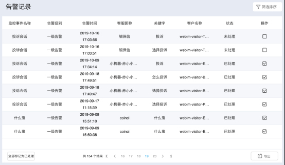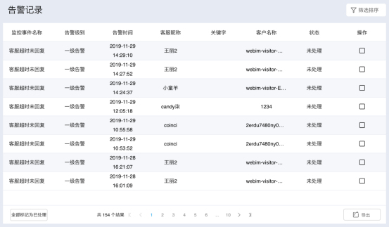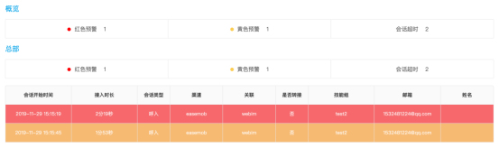 接待高峰期時,當前進行中會話數(shù)字龐大,服務過程中各種問題需要管理員去干預處理,讓管理者自己從所有的數(shù)據(jù)中去發(fā)現(xiàn)問題,無異于大海撈針。環(huán)信客服會話告警功能把所有管理者關(guān)注的問題拋露在表面,大大減輕了服務過程管控壓力。