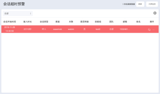 新增監(jiān)控設置,可設置各項監(jiān)控預警指標以及是否開啟相應功能。會話超時預警功能,可設置黃色預警和紅色預警閾值,會話時長達到閾值即可預警。超時會話與當前會話區(qū)分顯示,并自動標記黃色與紅色預警,可實時投放到大屏設備,按團隊分屏自動展示。大屏監(jiān)控上,超時會話一目了然,點擊可查看會話詳情,管理者可結(jié)束、轉(zhuǎn)接會話或督促客服處理,客服人員看到自己的會話超時,也會優(yōu)先處理。