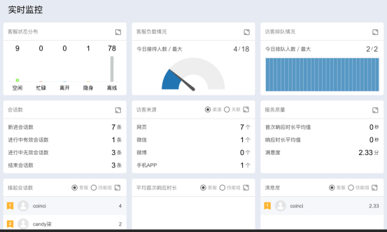 實時監(jiān)控支持實時查看客服狀態(tài)分布、客服負載情況、訪客排隊情況、會話數(shù)、訪客來源、服務質(zhì)量、接起會話數(shù)、平均首響、滿意度、平均響應時長。實時顯示租戶級(所有客服)客服狀態(tài)、接待量,以及客服的服務質(zhì)量和排名,便于快速了解目前客服團隊的工作情況。