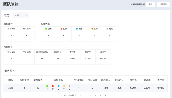 以團隊維度實時展示客服人員今日接待工作量與工作質(zhì)量指標,包含當前接待、最大接待、今日接起、今日結(jié)束、首次響應時長(平均值/最大值)、響應時長(平均值/最大值)、評價率、好評率、差評率等實時接待指標。上級團隊可查看本級及下級所有團隊匯總指標,及分團隊概覽和團隊內(nèi)客服明細指標。大屏監(jiān)控頁面使用自適應布局,可適配顯示器大小,在瀏覽器新標簽頁中顯示。只需將瀏覽器大屏監(jiān)控標簽頁拖放至顯示器設備,即可完成大屏投放。大屏監(jiān)控頁面可根據(jù)管理員所在團隊,獲取其數(shù)據(jù)權(quán)限,分屏分團隊展示管理員能查看的所有團隊數(shù)據(jù)。除此之外,大屏監(jiān)控上每位客服都能實時查看自己以及同事的接待情況,形成對比,間接激勵客服人員提升接待效率與服務質(zhì)量。