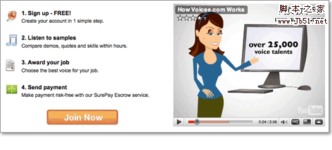 通常,一個(gè)潛在顧客面臨的最大轉(zhuǎn)化障礙是他們不知道他們注冊(cè)為用戶到底有什么好處。Voices.com通過(guò)增加一個(gè)能夠清楚傳達(dá)注冊(cè)作用的證言視頻客戶了這個(gè)問(wèn)題。