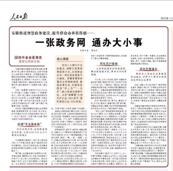 11月20日,《人民日?qǐng)?bào)》以《一張政務(wù)網(wǎng)通辦大小事(四中全會(huì)看落實(shí)·基層治理新實(shí)踐)》為題,大篇幅報(bào)道了安徽智慧政務(wù)建設(shè)成果,并對(duì)安徽智慧政務(wù)給予了高度肯定,報(bào)道稱(chēng):“安徽省智慧政務(wù)通過(guò)業(yè)務(wù)精細(xì)梳理、數(shù)據(jù)高度共享,技術(shù)充分應(yīng)用,實(shí)現(xiàn)政務(wù)服務(wù)“網(wǎng)上辦”“一次辦”“指尖辦”,方便了群眾辦事,同時(shí)也推動(dòng)了政府治理現(xiàn)代化。”