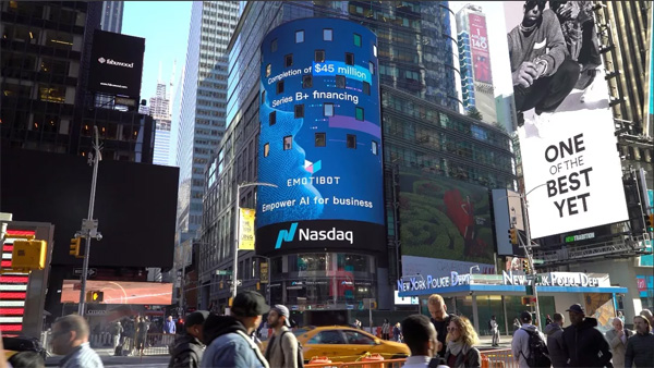 美國東部時間11月6日,竹間智能榮登紐約時代廣場納斯達克大屏,重磅發(fā)布B+輪4500萬美元融資消息,亮相國際舞臺。