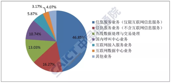 按照2015版《電信業(yè)務(wù)分類目錄》中增值電信業(yè)務(wù)分類,75538家增值電信企業(yè)合計擁有94764個許可項目。其中,44393個信息服務(wù)業(yè)務(wù)(僅限互聯(lián)網(wǎng)信息服務(wù)),15415個信息服務(wù)業(yè)務(wù)(不含互聯(lián)網(wǎng)信息服務(wù)),12352個在線數(shù)據(jù)處理與交易處理業(yè)務(wù),10179個國內(nèi)呼叫中心業(yè)務(wù),5562個互聯(lián)網(wǎng)接入服務(wù)業(yè)務(wù)(以下簡稱ISP),3006個互聯(lián)網(wǎng)數(shù)據(jù)中心業(yè)務(wù)(以下簡稱IDC),其他業(yè)務(wù)3857個。