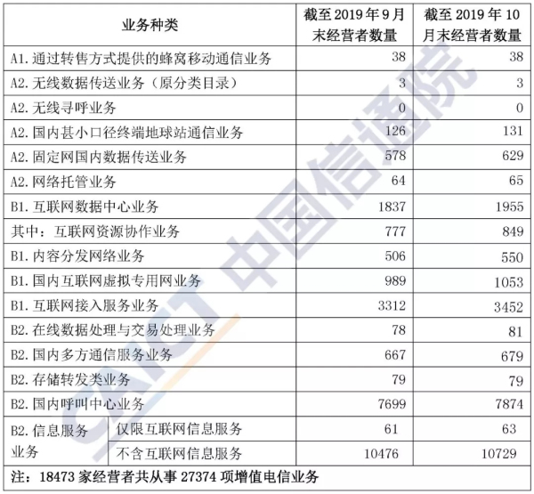 表1截至2019年10月末跨地區(qū)各類增值電信業(yè)務(wù)經(jīng)營者數(shù)量