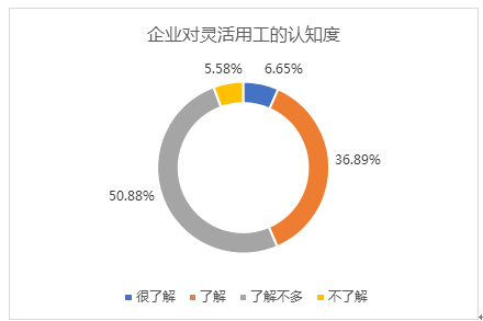 《2019年中國靈活用工發(fā)展白皮書》顯示,在今年參與調(diào)研的企業(yè)中只有5.6%明確表示對靈活用工“不了解”,而去年該數(shù)據(jù)為16.8%。此外,在今年參與調(diào)研的企業(yè)中有6.7%和36.9%表示對靈活用工“很了解”或“了解”。