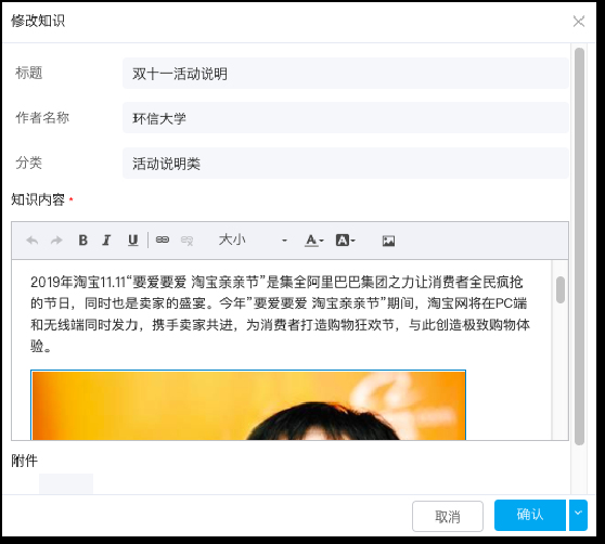 知識庫內(nèi)容可以是純文字或圖文消息,支持編輯文字格式。每條知識由標(biāo)題、知識內(nèi)容(純文本或圖文消息)、附件構(gòu)成。
