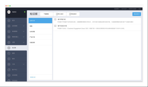首先,需要管理員進(jìn)入管理模式在知識庫頁面添加知識庫內(nèi)容,知識庫內(nèi)容可通過下載模板一鍵導(dǎo)入,也可直接上傳本地文件,還可直接添加三種方式。