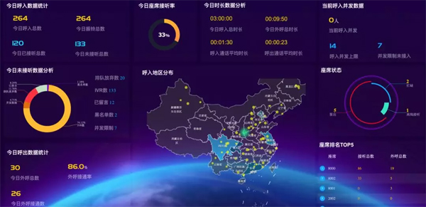 容聯(lián)七陌大屏監(jiān)控能將SAA吉諾服務(wù)過程中產(chǎn)生的多維度數(shù)據(jù)進(jìn)行整合,接聽率、座席狀態(tài)、未接聽、呼入地區(qū)分布、并發(fā)數(shù)據(jù)等數(shù)據(jù)進(jìn)行可視化分析展示,實(shí)現(xiàn)對(duì)平臺(tái)智能化監(jiān)控預(yù)警和調(diào)度監(jiān)控。