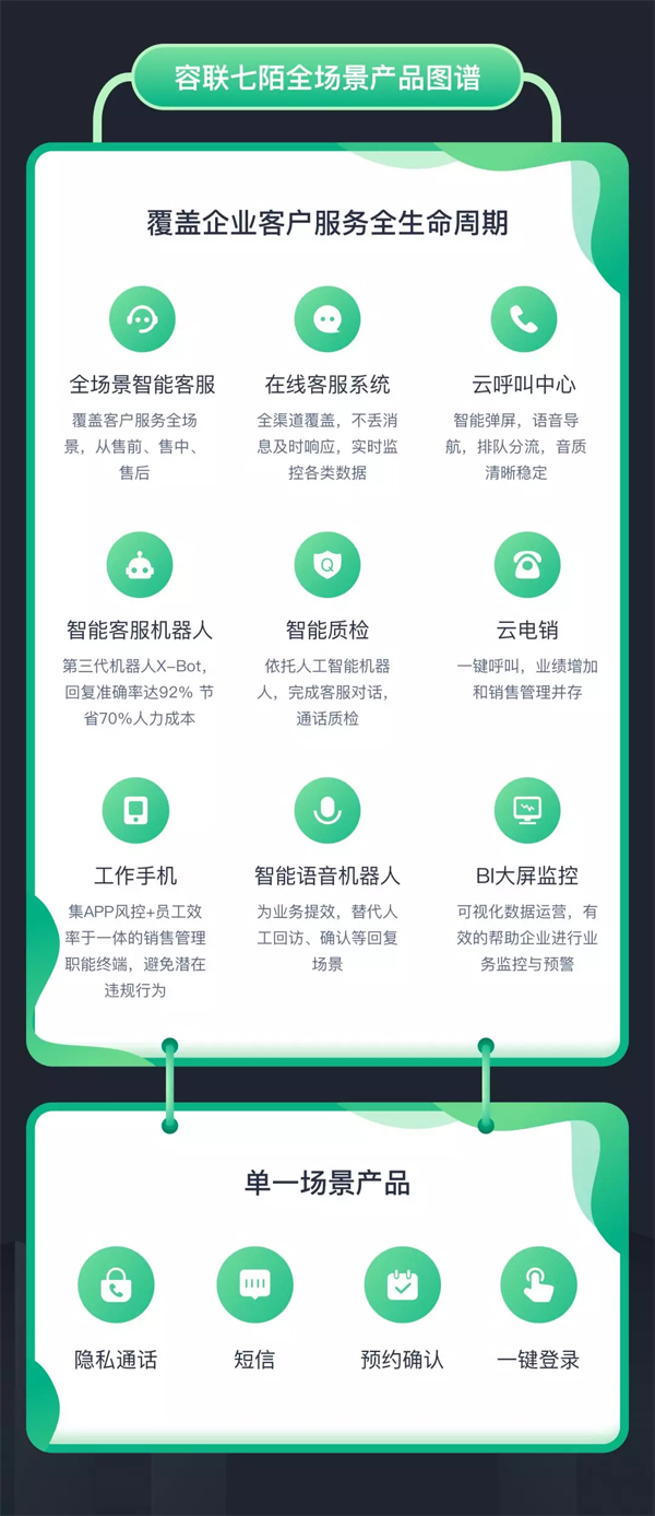 在高新技術(shù)加碼下的客戶服務(wù)有了全新的變化,從傳統(tǒng)單一的呼叫中心電話客服到多渠道整合機(jī)器人與人工協(xié)作的智能服務(wù)。智能化的到來改變了客戶服務(wù)的傳統(tǒng)模式,在企業(yè)用人成本高居不下的情況下,智能化產(chǎn)品引進(jìn)可以降低企業(yè)人力成本。高效、智能、場景化的產(chǎn)品更能解決企業(yè)服務(wù)需求。容聯(lián)七陌從智能客服領(lǐng)域出發(fā),不斷為企業(yè)提供提效增速的產(chǎn)品解決方案,目前產(chǎn)品覆蓋了企業(yè)服務(wù)全領(lǐng)域場景。
