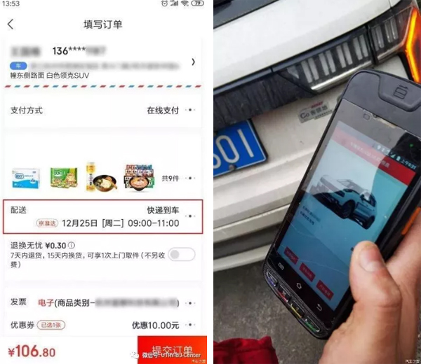 車主在某東APP或網(wǎng)站綁定車輛賬號,下單后選擇快遞到車服務。快遞員派送時直接將快遞放置到車內(nèi)。