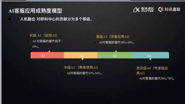 李總通過人機融合對呼叫中心的貢獻度,將人機融合的成熟度劃分為四個等級,分別為初級A1,即啟動AI階段,此時AI對客服的代替低于10%;中級A2,即熟練使用AI階段,此時AI對客服的替代為10%-30%;高級A3,即深度應用AI階段,此時AI對客服的替代為30%-50%;以及資深級A4,即專家級應用AI階段,此時AI對客服的替代為50%-70%。通過將人機融合的不斷深入應用,逐步提升呼叫中心內(nèi)機器人貢獻率。人機融合是智能語音客服的進一步發(fā)展趨勢,也是進一步拓寬智能語音應用范圍、替代更多簡單人工服務、提升坐席服務水平的重要趨勢之一。同時,人機融合可以保證人和AI客服在最需要的時候出現(xiàn),而不僅僅是簡單任務交給AI,AI無法解決再轉人工的傳統(tǒng)模式。從而進一步提升用戶體驗,提高客服工作效率。