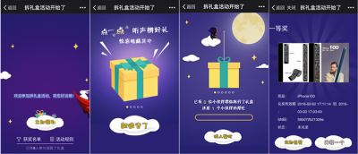 拆禮盒:粉絲將禮盒分享給指定數(shù)量的小伙伴,即能拆開商家的禮盒,中獎(jiǎng)隨機(jī)。將活動(dòng)禮品設(shè)為母親節(jié)相關(guān),以“為媽媽拆禮盒”等為宣傳口號(hào),吸引粉絲積極參與。在提升粉絲活躍度的同時(shí),拆禮盒應(yīng)用的極強(qiáng)傳播屬性,還能大力提升商家品牌傳播力度。
