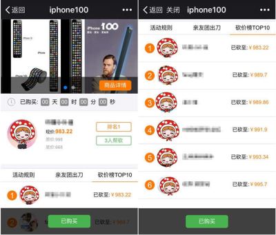 2. 微享寶微砍價(jià):粉絲在商家規(guī)定的砍價(jià)時(shí)間內(nèi),將活動(dòng)分享給好友,讓好友幫忙砍價(jià)。砍掉的價(jià)格在商家設(shè)置的范圍內(nèi)隨機(jī)生成。將具有吸引力的活動(dòng)商品結(jié)合好玩的砍價(jià)方式,不僅能在節(jié)日為商家?guī)?lái)大量的漲粉,而且還能在朋友圈引起粉絲“共鳴”,帶來(lái)商品的爆炸式傳播效應(yīng)。